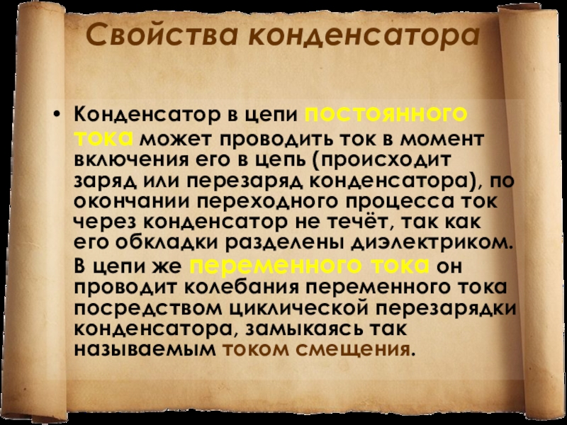 в цепь (происходит заряд или перезаряд конденсатора), по окончании переходного процесса ток через конденсатор не течёт, так как его обкладки разделены диэлектриком. В цепи же переменного тока он проводит колебания переменного тока посредством циклической перезарядки конденсатора, замыкаясь так называемым током смещения.
