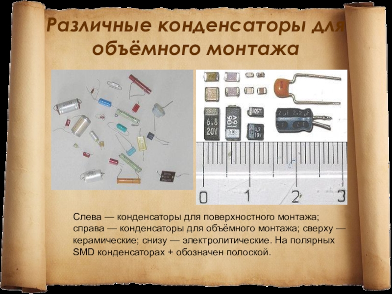 Слайд 5Различные конденсаторы для объёмного монтажа