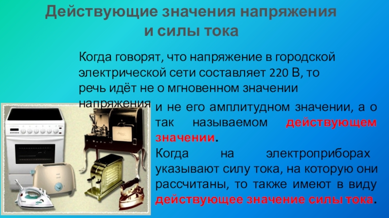 Когда говорят, что напряжение в городской электрической сети составляет 220 В, то речь идёт не о мгновенном значении напряжения