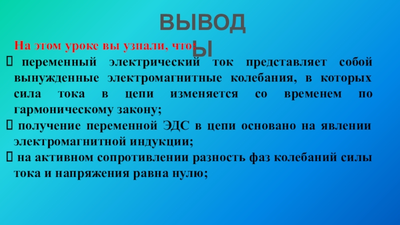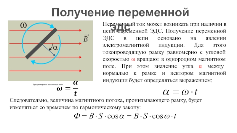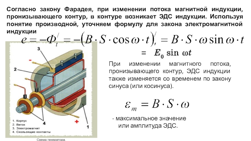 При изменении магнитного потока, пронизывающего контур, ЭДС индукции также изменяется со временем по закону синуса (или косинуса).