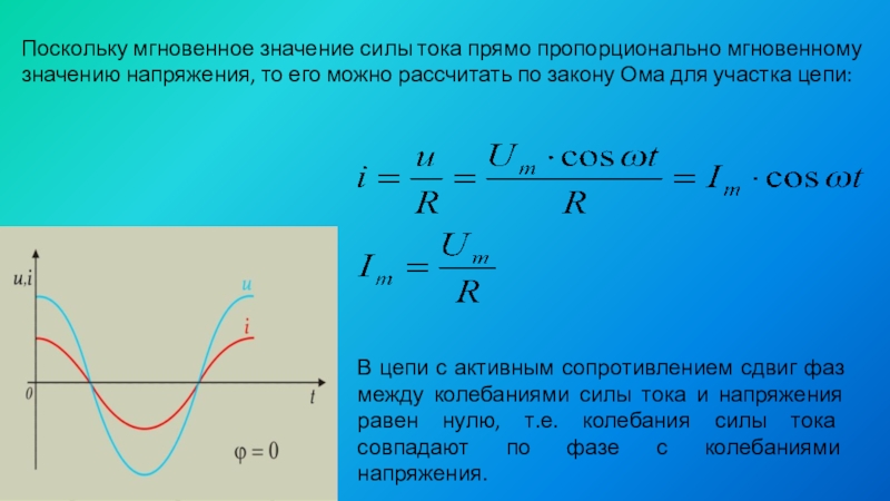 В цепи с активным сопротивлением сдвиг фаз между колебаниями силы тока и напряжения равен нулю, т.е. колебания силы тока совпадают по фазе с колебаниями напряжения.