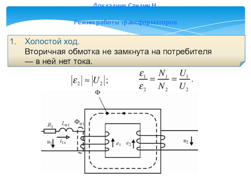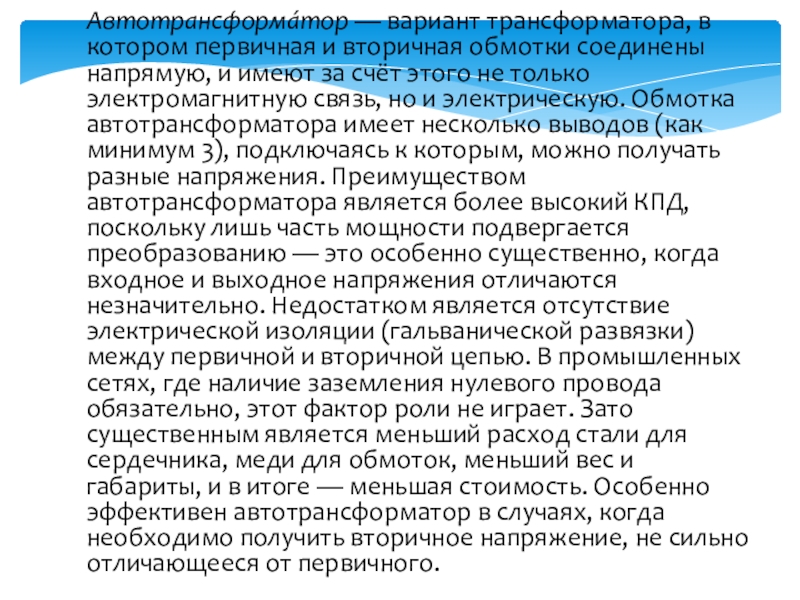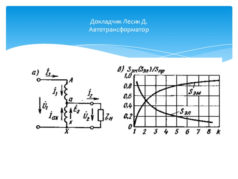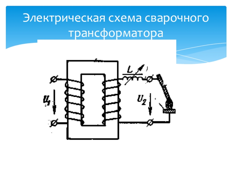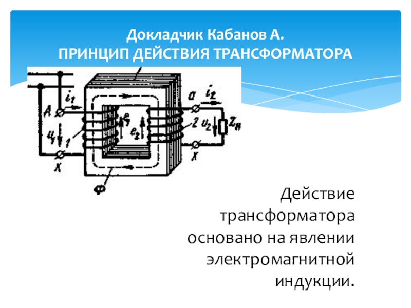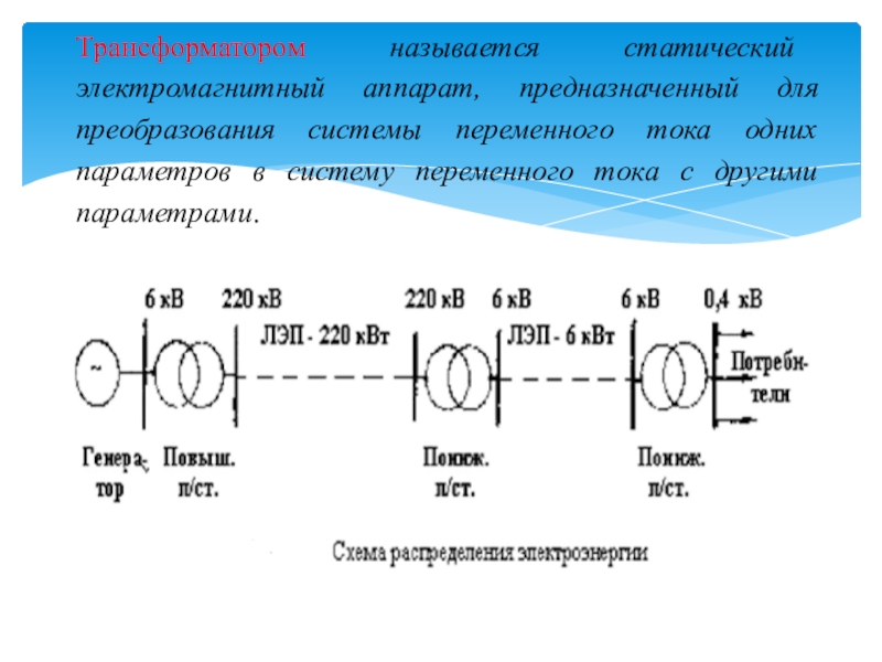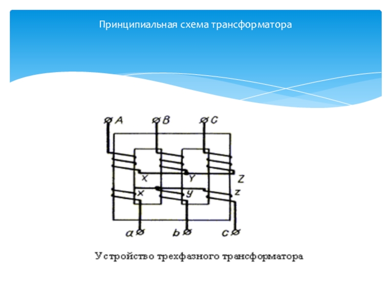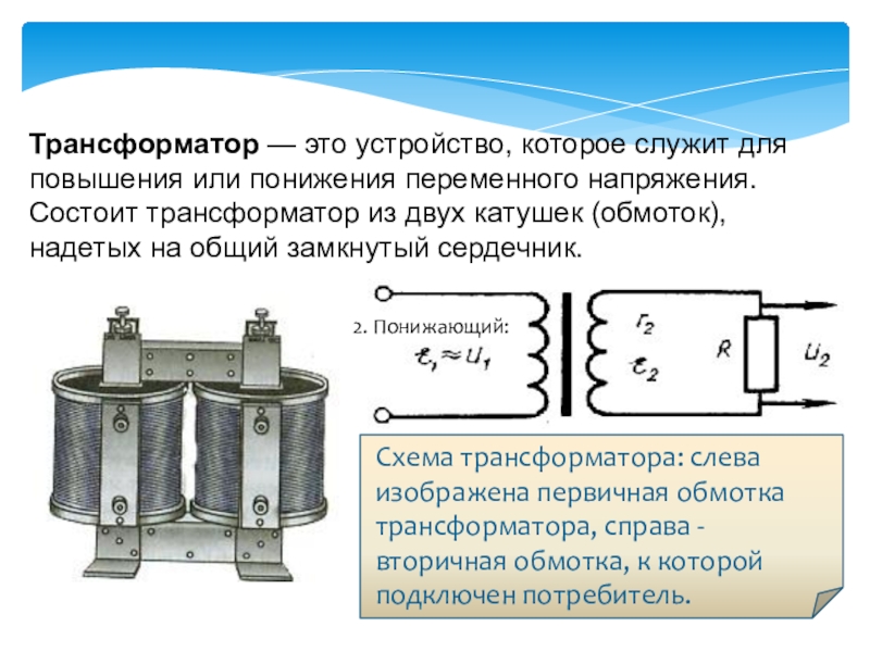 Схема трансформатора: слева изображена первичная обмотка трансформатора, справа - вторичная обмотка, к которой подключен потребитель.