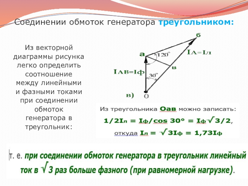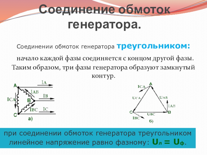 при соединении обмоток генератора треугольником линейное напряжение равно фазному: Uл = Uф.