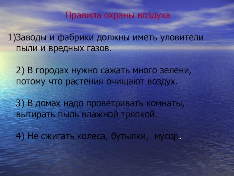 Правила охраны воздухаЗаводы и фабрики должны иметь уловители пыли и вредных газов.2) В городах нужно сажать много зелени, потому что растения очищают воздух.3) В домах надо проветривать комнаты, вытирать пыль влажной тряпкой.4) Не сжигать колеса, бутылки,
