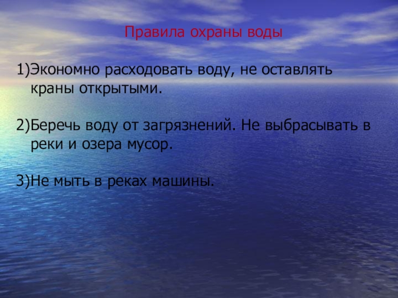 Правила охраны водыЭкономно расходовать воду, не оставлять краны открытыми.Беречь воду от загрязнений. Не выбрасывать в реки и
