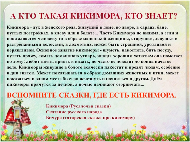 Слайд 8ВСПОМНИТЕ СКАЗКИ, ГДЕ ЕСТЬ КИКИМОРА.