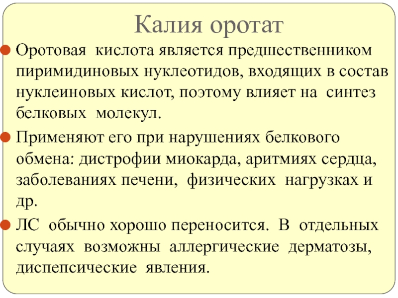 Применяют его при нарушениях белкового обмена: дистрофии миокарда, аритмиях сердца, заболеваниях печени, физических нагрузках и др.