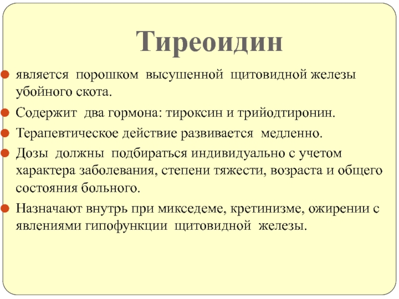 Назначают внутрь при микседеме, кретинизме, ожирении с явлениями гипофункции щитовидной железы.