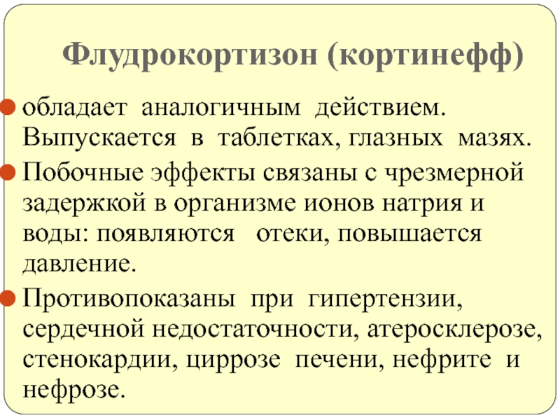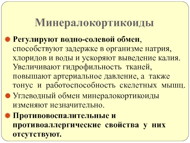 задержку в организме ионов натрия, калия, хлора, суживает сосуды, повышает артериальное давление, усиливает сокращение гладких мышц кишечника, мочевого пузыря.