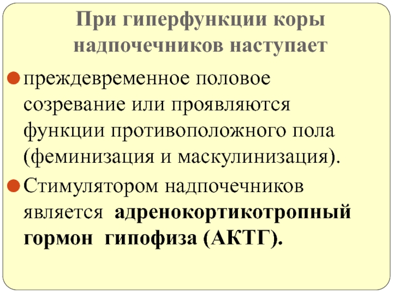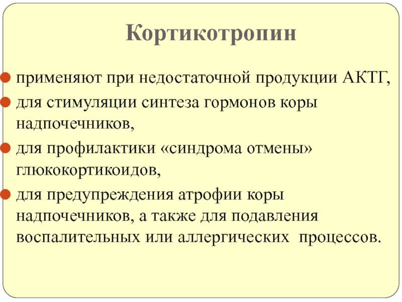 стимулирует продукцию гормонов коры надпочечников – глюкокортикоидов.