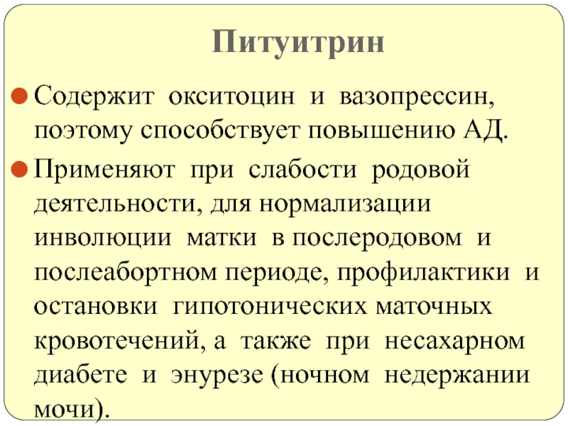 слабости родовой деятельности, для нормализации инволюции матки в послеродовом и послеабортном периоде, профилактики и остановки гипотонических маточных кровотечений, а также при несахарном диабете и энурезе (ночном недержании мочи).