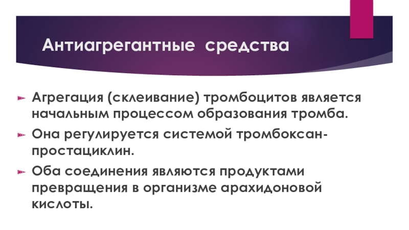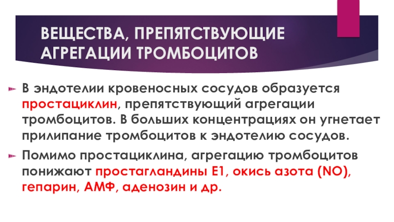 Слайд 22ВЕЩЕСТВА, ПРЕПЯТСТВУЮЩИЕ АГРЕГАЦИИ ТРОМБОЦИТОВ