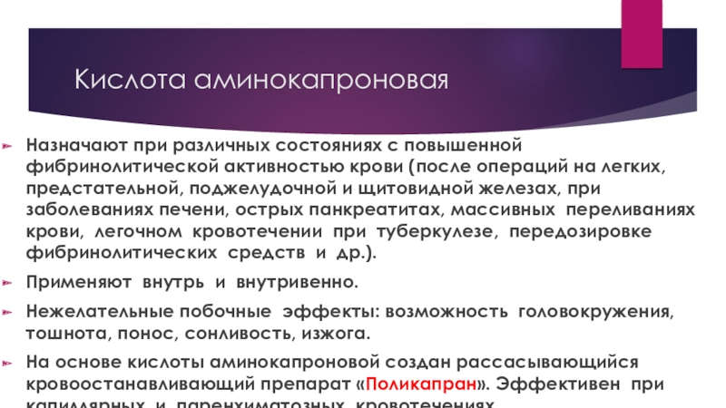 Назначают при различных состояниях с повышенной фибринолитической активностью крови
