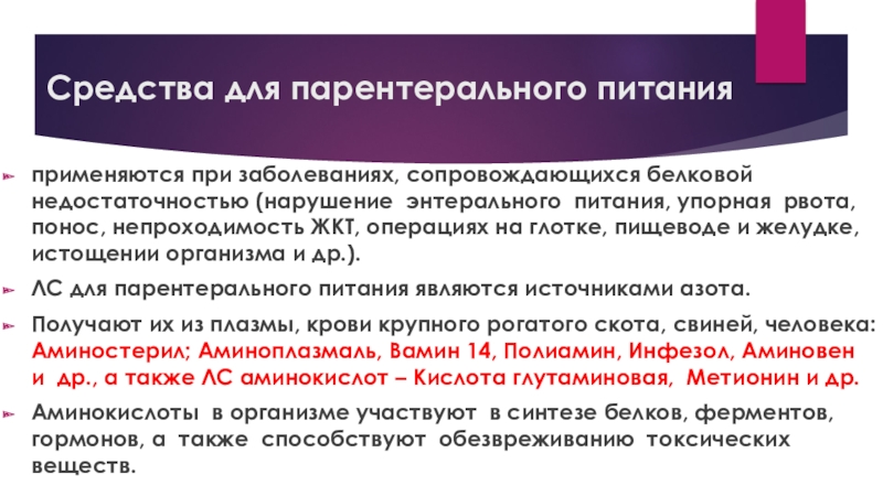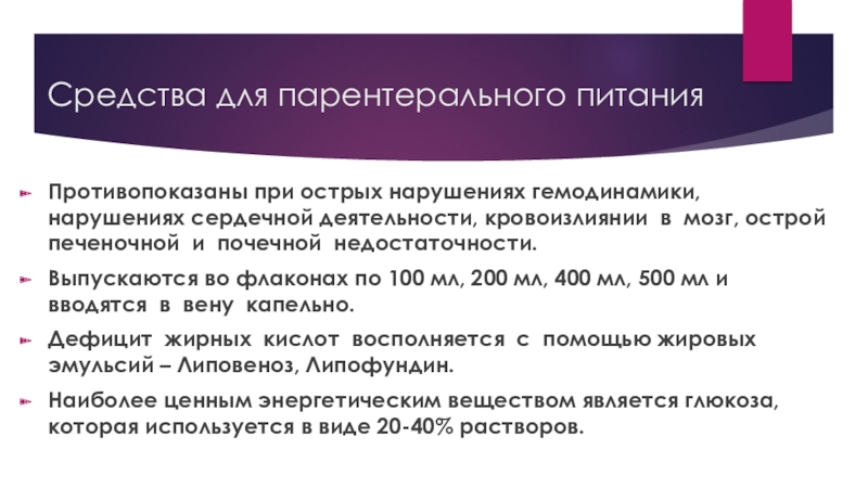 энтерального питания, упорная рвота, понос, непроходимость ЖКТ, операциях на глотке, пищеводе и желудке, истощении организма и др.).