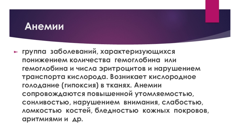 эритроцитов и нарушением транспорта кислорода. Возникает кислородное голодание (гипоксия) в тканях. Анемии сопровождаются повышенной утомляемостью, сонливостью, нарушением внимания, слабостью, ломкостью костей, бледностью кожных покровов, аритмиями и др.