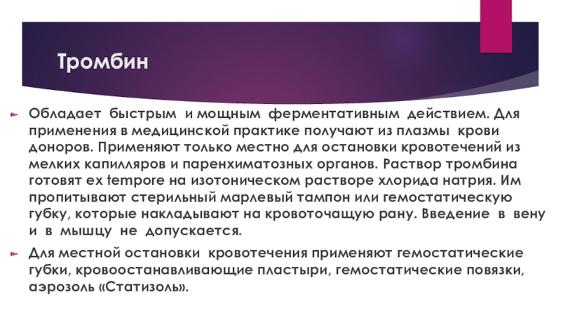 практике получают из плазмы крови доноров. Применяют только местно для остановки кровотечений из мелких капилляров и паренхиматозных органов. Раствор тромбина готовят ex tempore на изотоническом растворе хлорида натрия. Им пропитывают стерильный марлевый тампон или гемостатическую губку, которые накладывают на кровоточащую рану. Введение в вену и в мышцу не допускается.