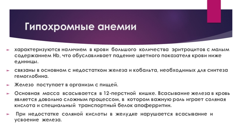 При недостатке соляной кислоты в желудке нарушается всасывание и усвоение железа.