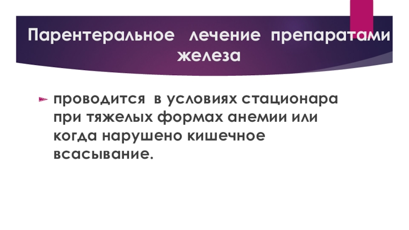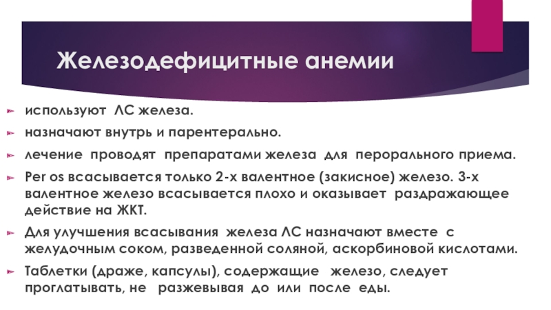 Per os всасывается только 2-х валентное (закисное) железо. 3-х валентное железо всасывается плохо и оказывает раздражающее действие на ЖКТ.