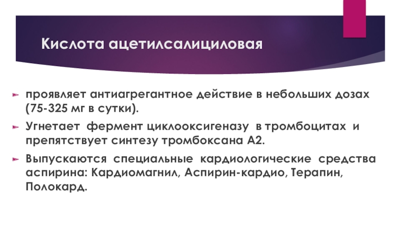 проявляет антиагрегантное действие в небольших дозах (75-325 мг в