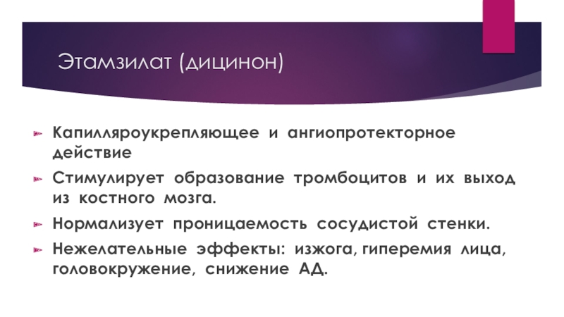 тромбоцитов. В больших концентрациях он угнетает прилипание тромбоцитов к эндотелию сосудов.