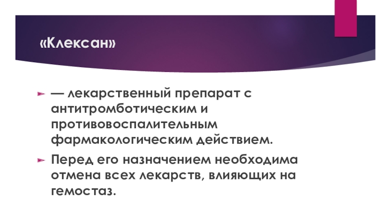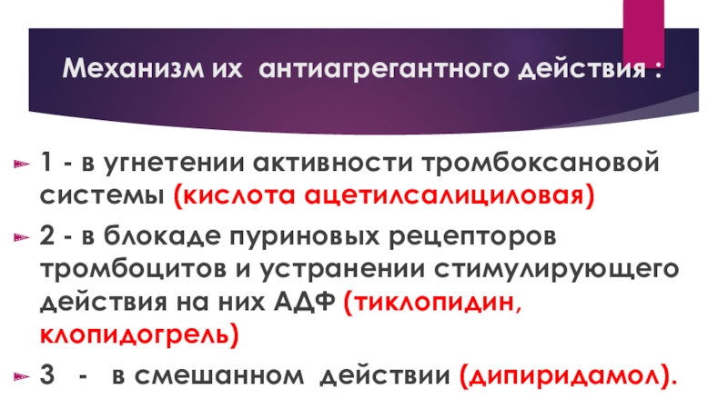 2 - в блокаде пуриновых рецепторов тромбоцитов и устранении стимулирующего действия на них АДФ (тиклопидин, клопидогрель)