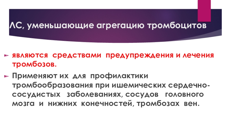 Слайд 23ЛС, уменьшающие агрегацию тромбоцитов