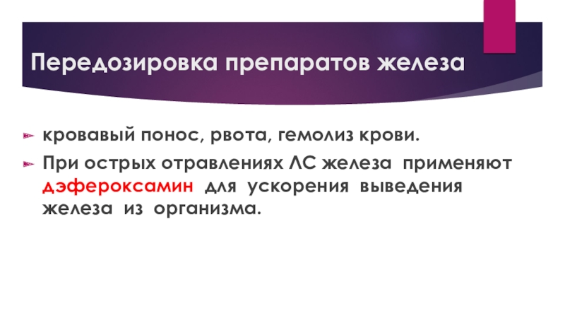 железа применяют дэфероксамин для ускорения выведения железа из организма.