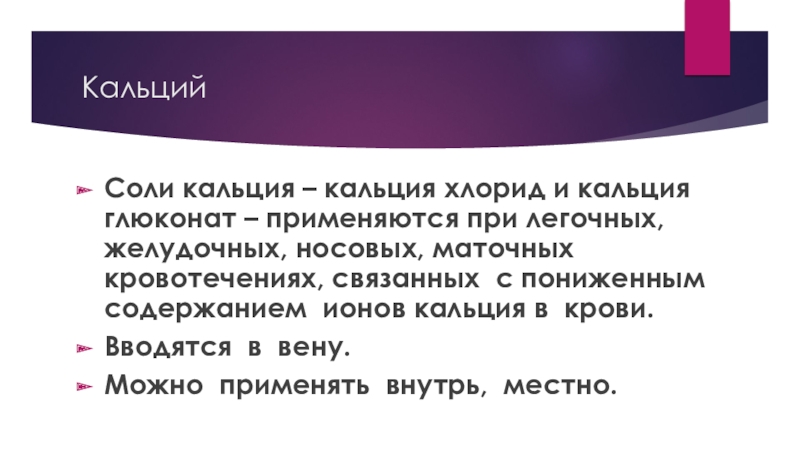 при легочных, желудочных, носовых, маточных кровотечениях, связанных с пониженным содержанием ионов кальция в крови.