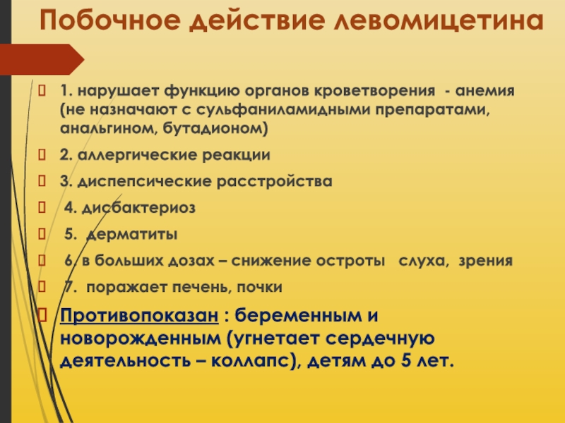 1. нарушает функцию органов кроветворения - анемия (не назначают
