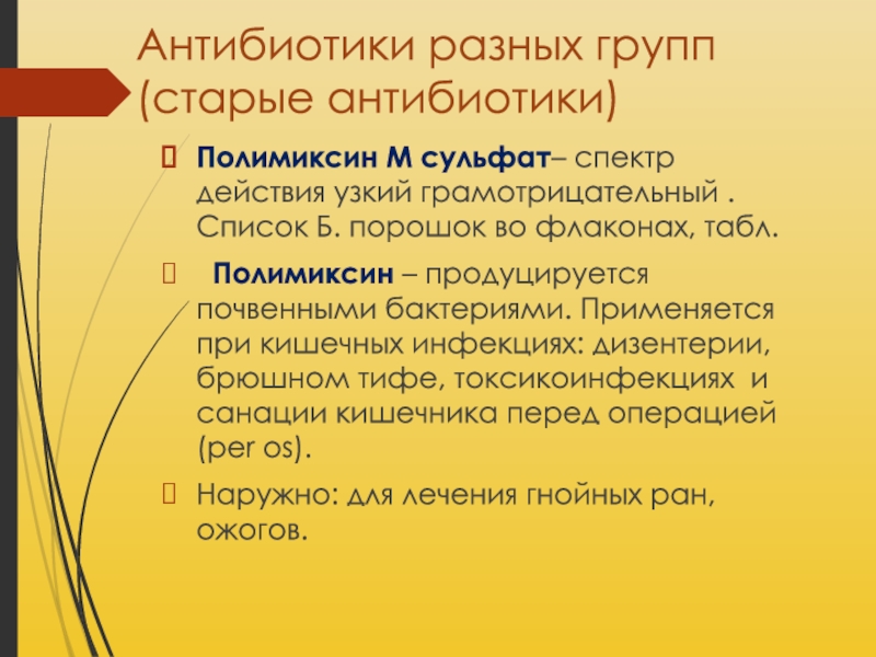 Полимиксин – продуцируется почвенными бактериями. Применяется при кишечных инфекциях: дизентерии, брюшном тифе, токсикоинфекциях и санации кишечника перед операцией (per os).