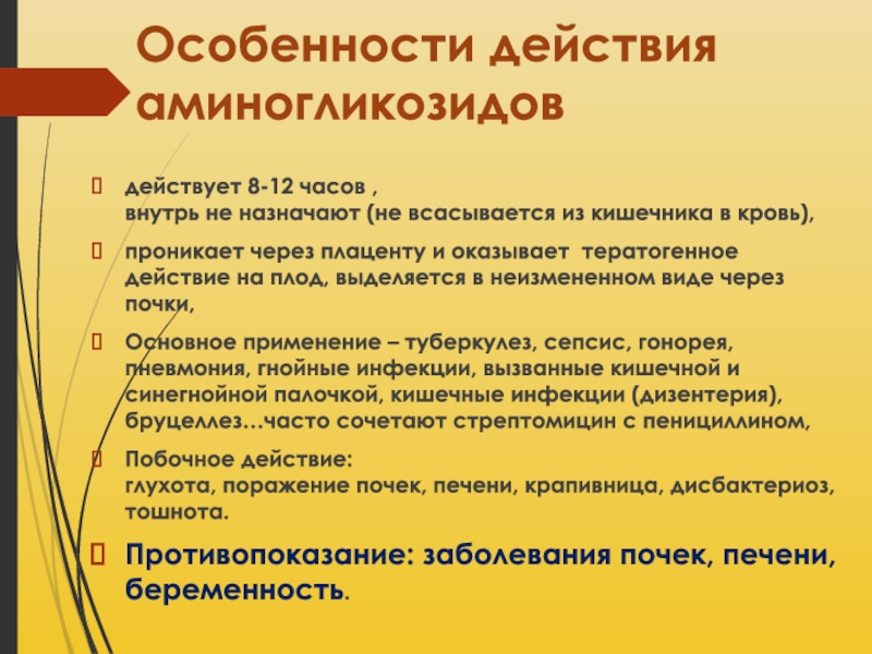 Основное применение – туберкулез, сепсис, гонорея, пневмония, гнойные инфекции, вызванные кишечной и синегнойной палочкой, кишечные инфекции (дизентерия), бруцеллез…часто сочетают стрептомицин с пенициллином,