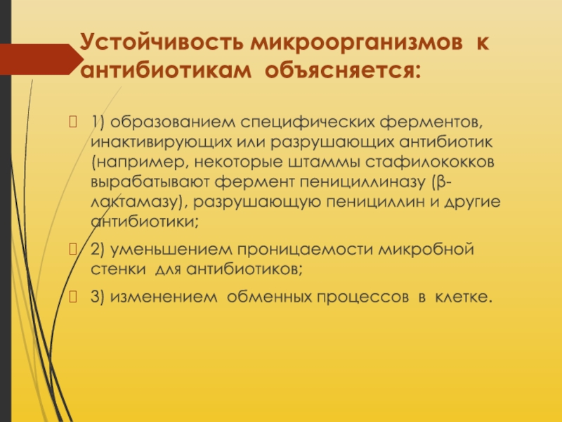 Слайд 14Устойчивость микроорганизмов к антибиотикам объясняется: