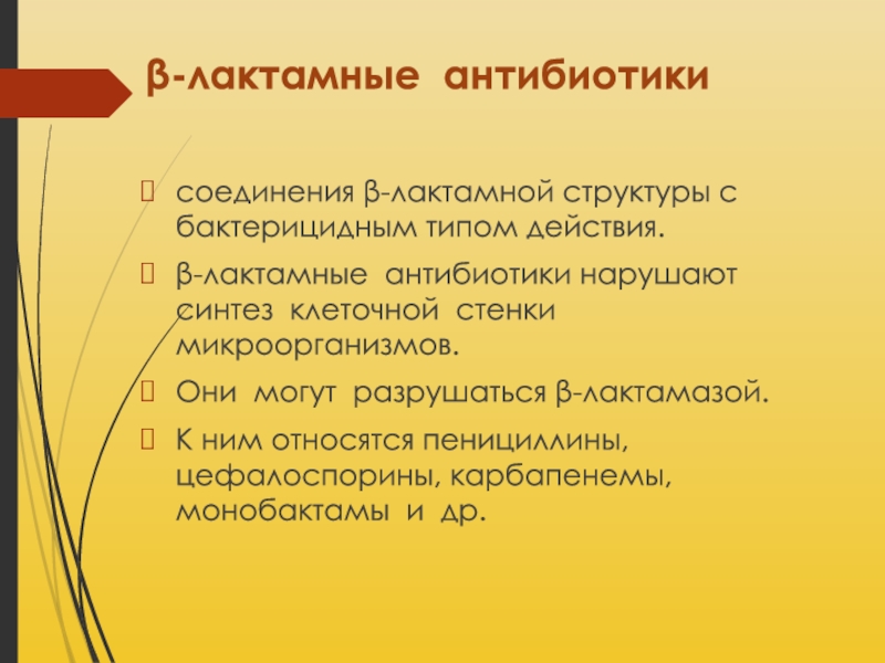 К ним относятся пенициллины, цефалоспорины, карбапенемы, монобактамы и др.