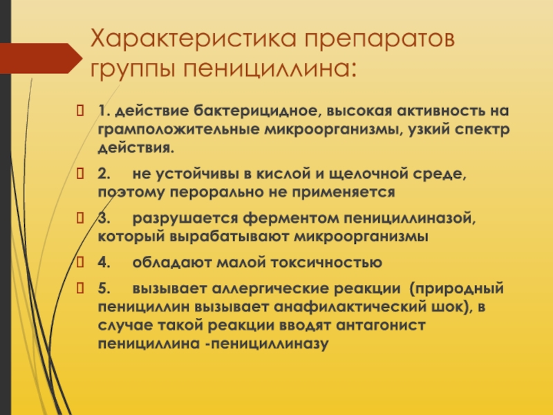 5. вызывает аллергические реакции (природный пенициллин вызывает анафилактический шок), в случае такой реакции вводят антагонист пенициллина -пенициллиназу