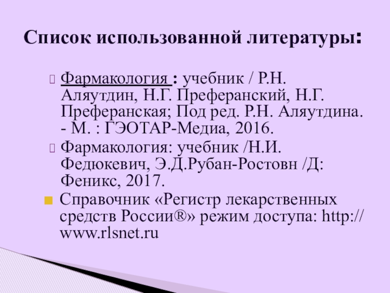 Справочник «Регистр лекарственных средств России®» режим доступа: http:// www.rlsnet.ru