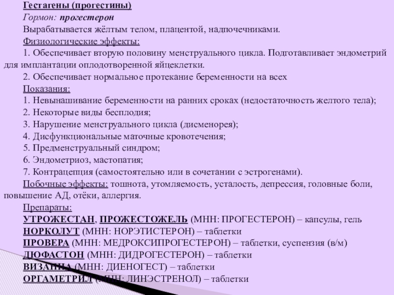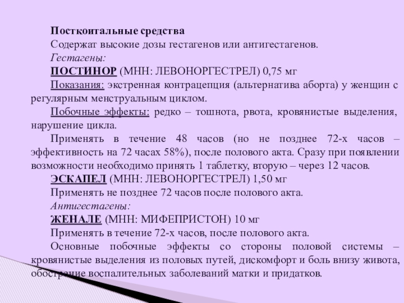 Побочные эффекты: редко – тошнота, рвота, кровянистые выделения, нарушение цикла.