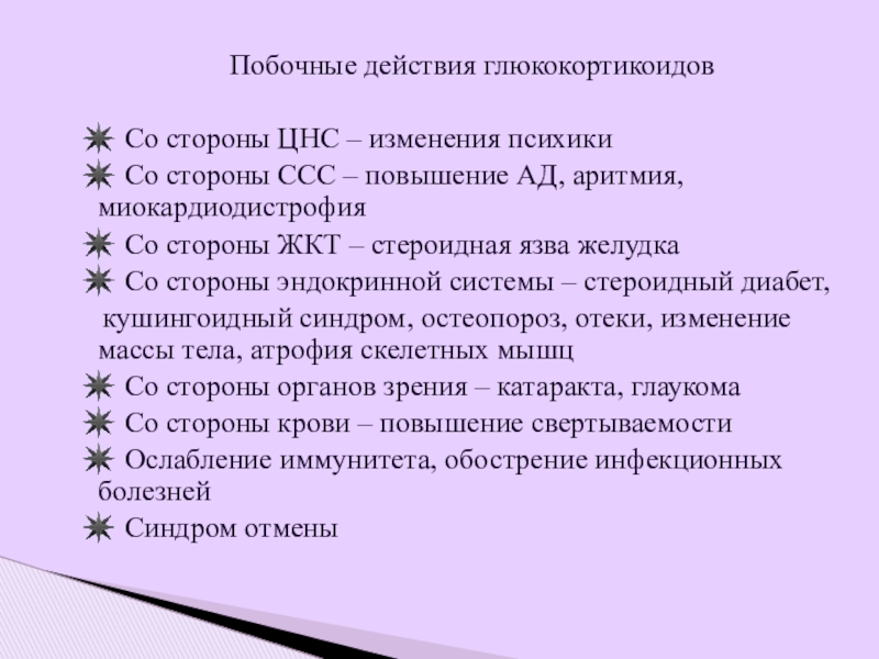 Со стороны ССС – повышение АД, аритмия, миокардиодистрофия