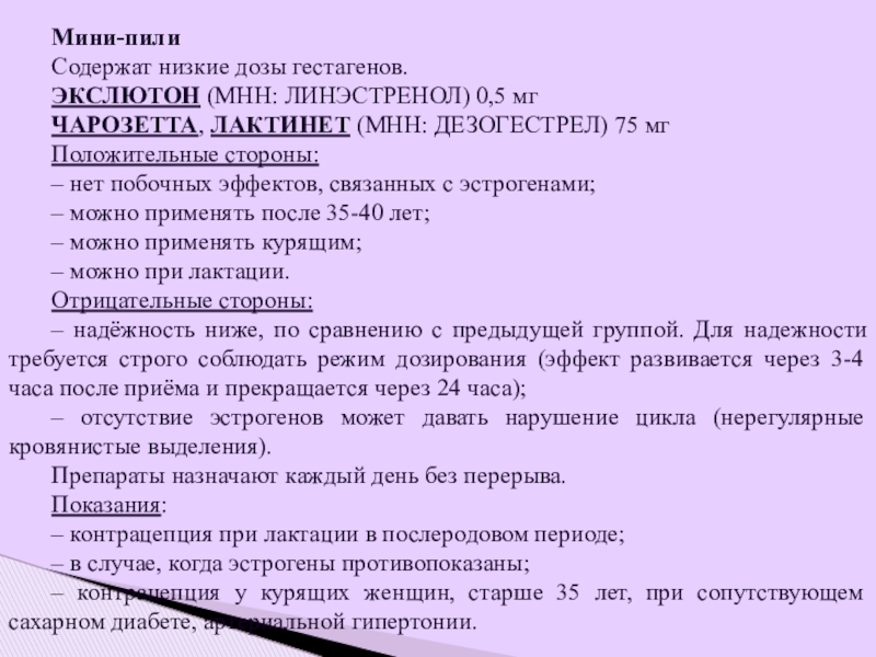– контрацепция у курящих женщин, старше 35 лет, при сопутствующем сахарном диабете, артериальной гипертонии.