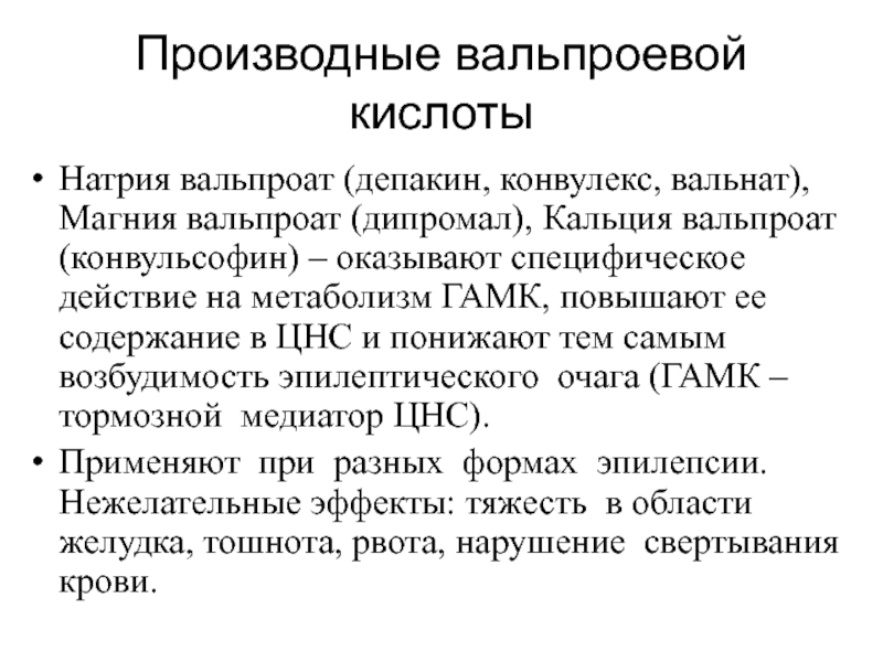 Кальция вальпроат (конвульсофин) – оказывают специфическое действие на метаболизм ГАМК, повышают ее содержание в ЦНС и понижают тем самым возбудимость эпилептического очага (ГАМК – тормозной медиатор ЦНС).