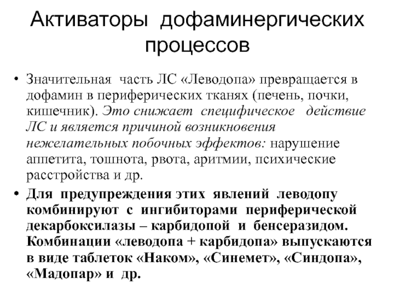 Для предупреждения этих явлений леводопу комбинируют с ингибиторами периферической декарбоксилазы – карбидопой и бенсеразидом. Комбинации «леводопа + карбидопа» выпускаются в виде таблеток «Наком», «Синемет», «Синдопа», «Мадопар» и др.