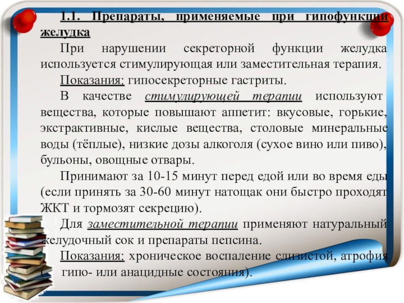 Слайд 71.1. Препараты, применяемые при гипофункции желудка