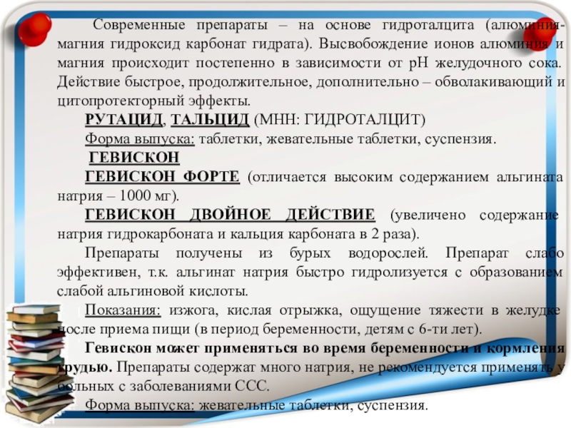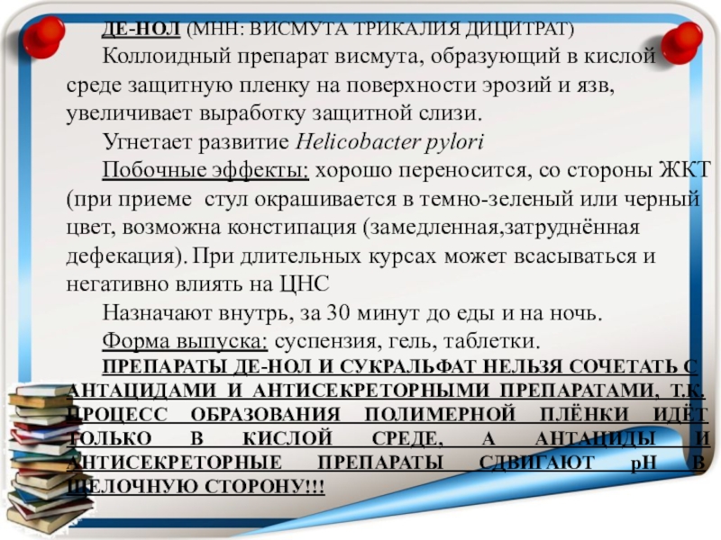 факторов в дневное и ночное время. Уменьшают боли, способствуют рубцеванию язв.