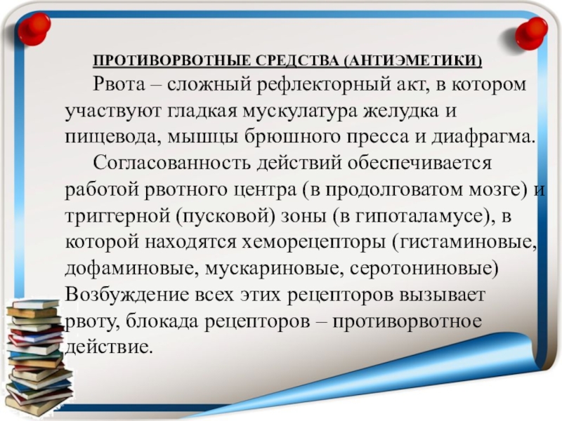 Согласованность действий обеспечивается работой рвотного центра (в продолговатом мозге) и триггерной (пусковой) зоны (в гипоталамусе), в которой находятся хеморецепторы (гистаминовые, дофаминовые, мускариновые, серотониновые) Возбуждение всех этих рецепторов вызывает рвоту, блокада рецепторов – противорвотное действие.