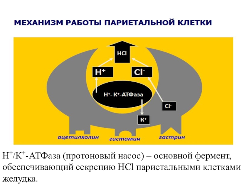 Слайд 11Н+/К+-АТФаза (протоновый насос) – основной фермент, обеспечивающий секрецию HCl париетальными клетками