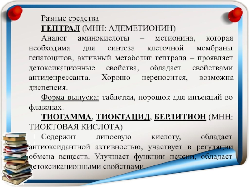 клеточной мембраны гепатоцитов, активный метаболит гептрала – проявляет детоксикационные свойства, обладает свойствами антидепрессанта. Хорошо переносится, возможна диспепсия.