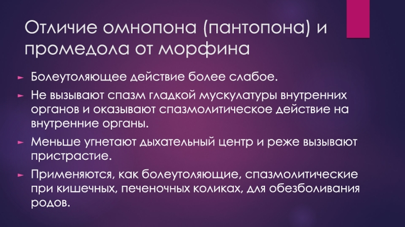 Слайд 17Отличие омнопона (пантопона) и промедола от морфина