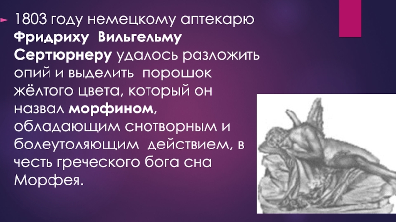 Слайд 31803 году немецкому аптекарю Фридриху Вильгельму Сертюрнеру удалось разложить опий и
