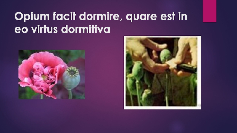 Слайд 2Opium facit dormire, quare est in eo virtus dormitiva