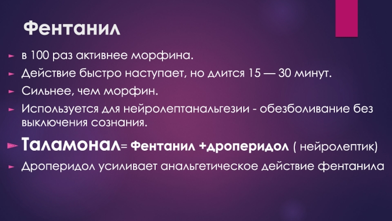 Таламонал= Фентанил +дроперидол ( нейролептик)