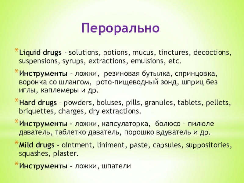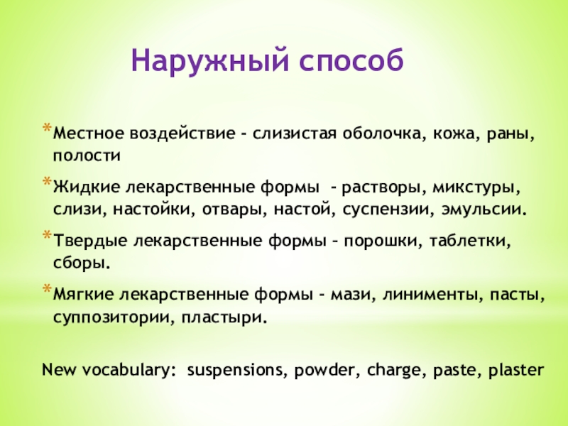 Mild drugs - ointment, liniment, paste, capsules, suppositories, squashes, plaster.